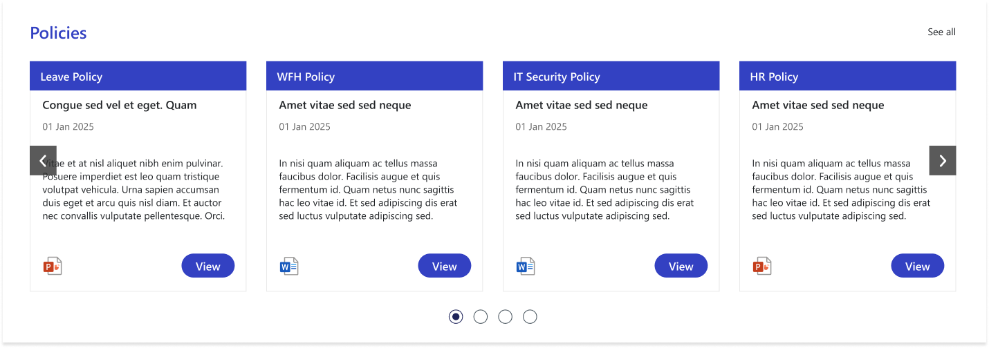 The Policies Web Part provides a streamlined, card-based carousel that highlights important organizational policies in an easy-to-browse format. Each card displays the policy category, title, brief description, published date, and relevant file type icon, ensuring quick recognition and access. Users can navigate through multiple policies using arrow controls or view the complete list through the “See All” option, making this web part an efficient way to stay informed about company guidelines.