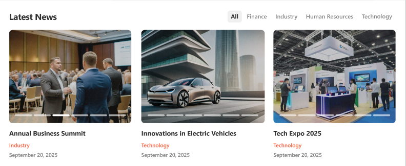 This News web part showcases recent articles and events with eye-catching images and clear categorization by topics like Finance, Industry, HR, and Technology. Users can quickly browse and filter news items, keeping everyone informed and connected on the SharePoint site.